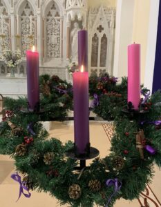 Purple is the colour dominating Churches during Advent. Vestments, Candles and Banners are all in Purple.