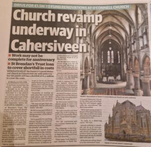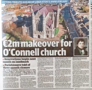 The Daniel O’Connell Memorial Church is currently closed to allow the installation of new electrical and heating systems together with new floor covering. It is planned to complete the works by mid-September. The cost is estimated to be €2 million. We would be most grateful if you would support our church restoration fund. Donations can be made to the following account: IBAN IE 58AIBK93603012221056